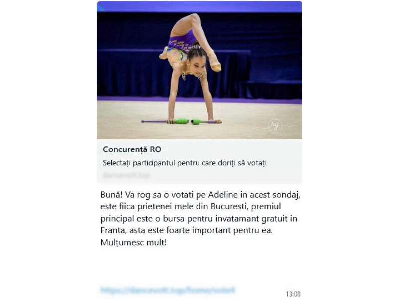 Mesajul arăta astfel: „Bună! Te rog să o votezi pe Adeline în acest sondaj. Este fiica prietenei mele, iar premiul este o bursă pentru studii în Franța. Mulțumesc mult!” urmat de un link malițios.
