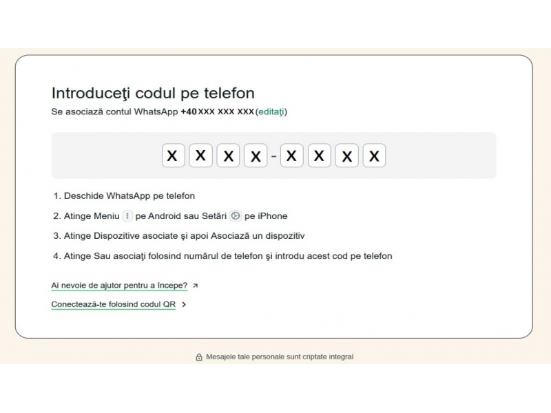 Astfel, folosind acea opțiune, autorii introduc o solicitare de asociere pe alte dispozitive a contului aferent aplicației de mesagerie al potențialei victime, prin introducerea numărului de telefon al acesteia.