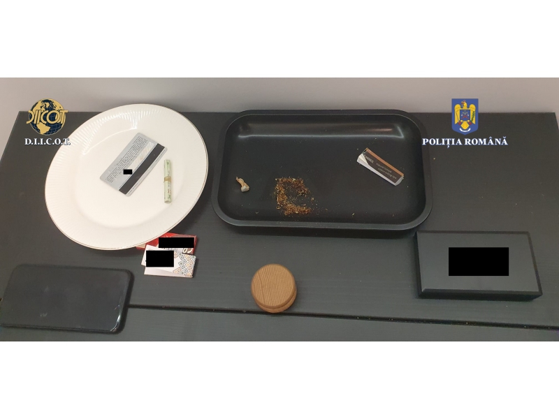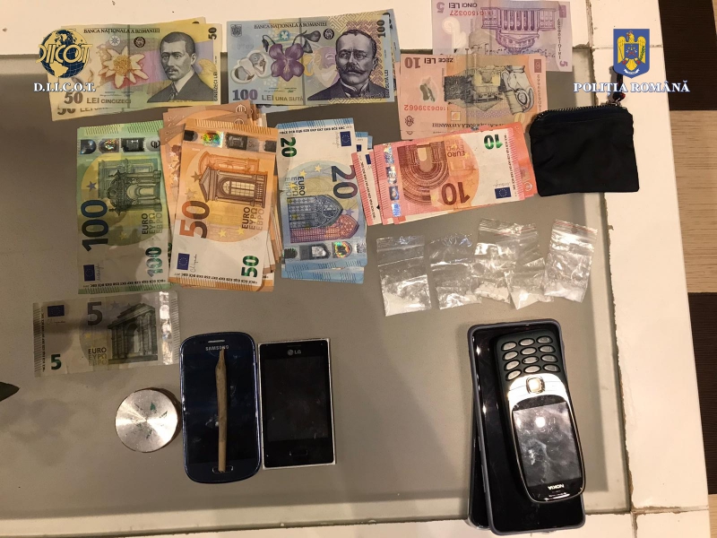 În urma perchezițiilor, au fost descoperite și ridicate 5 doze/pliculețe cu cocaină, o pastilă M.D.M.A., o țigaretă cu fragmente vegetale, verde olive, 6 telefoane mobile, 965 de euro, 350 de lei și 3 grindere.